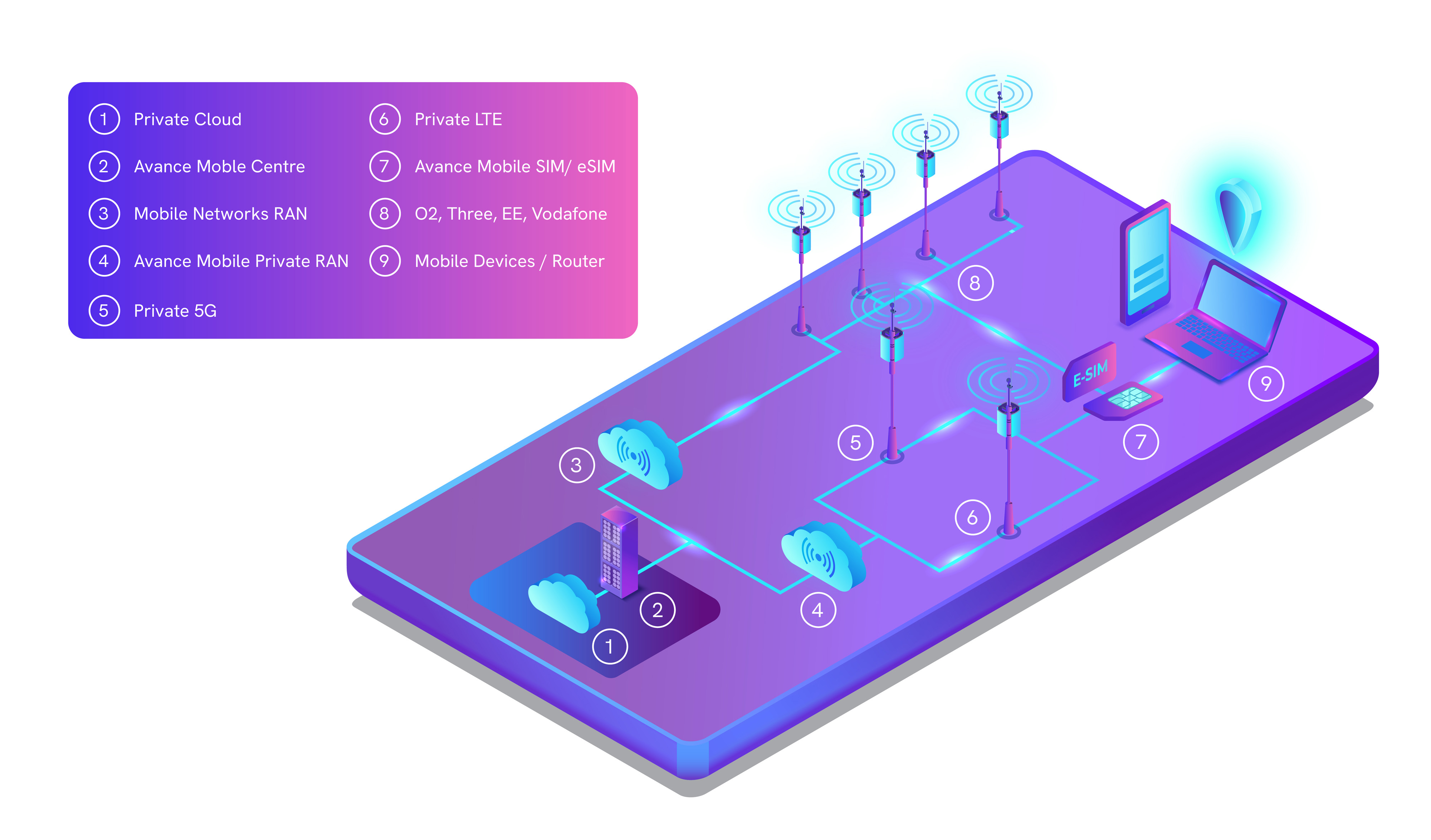 Avance mobile data works across phones, routers and IoT devices. Our mobile core cluster runs within our datacentres and connects to all major mobile radio networks, so you get the best possible service wherever work takes you.
